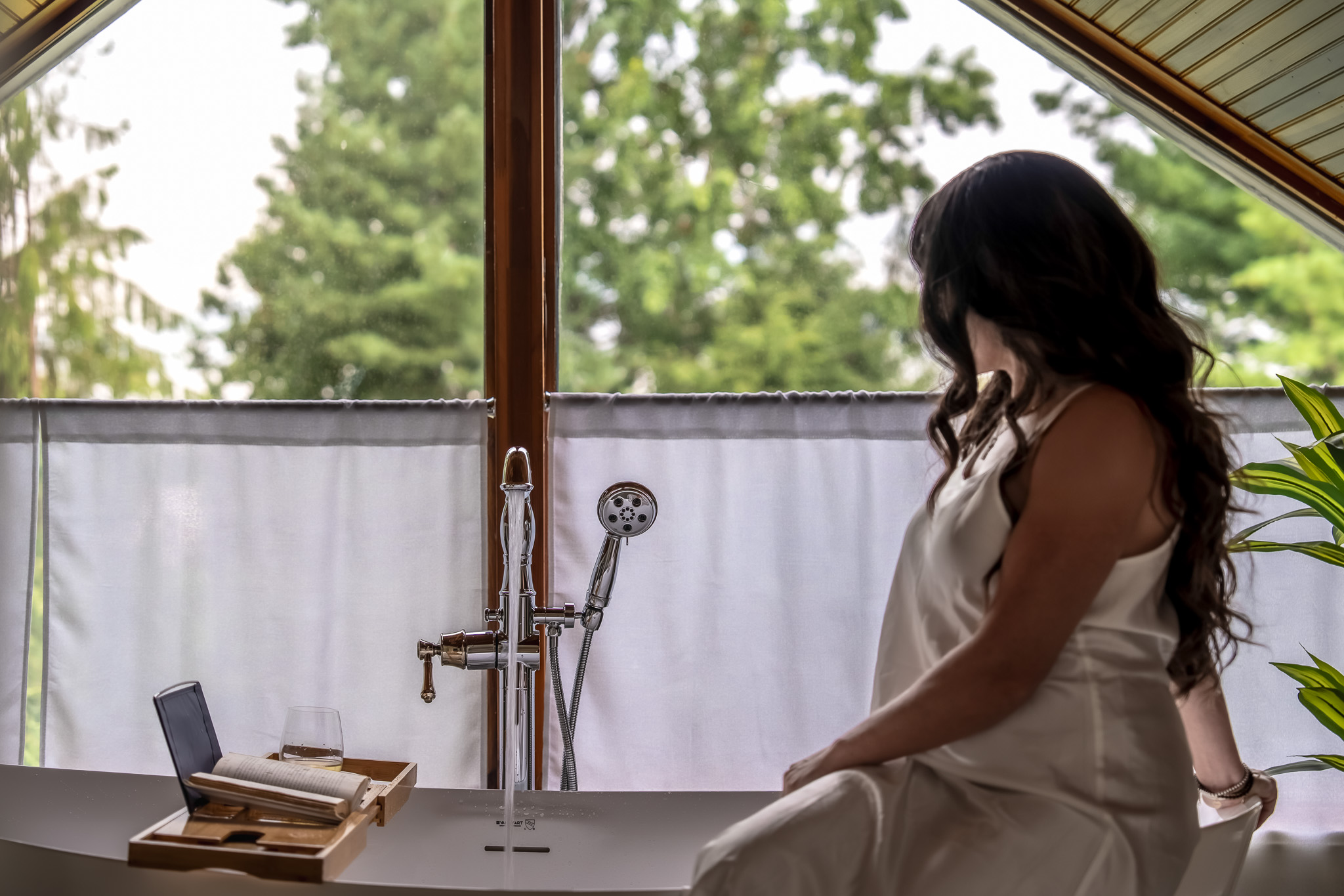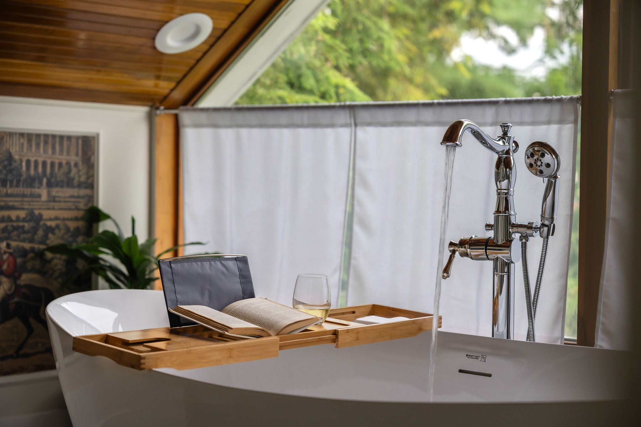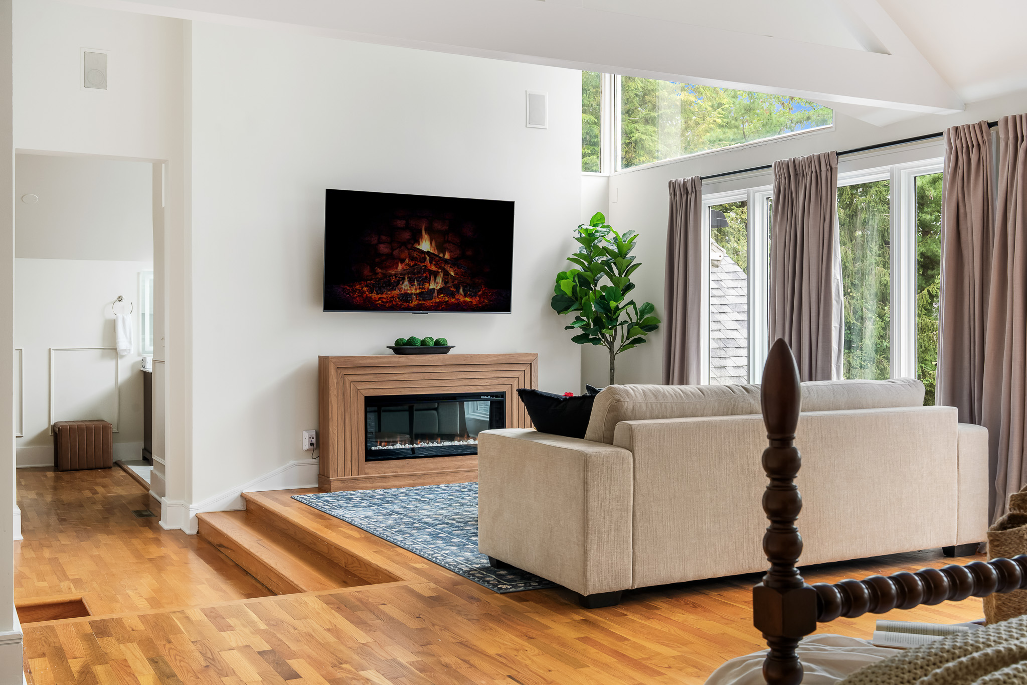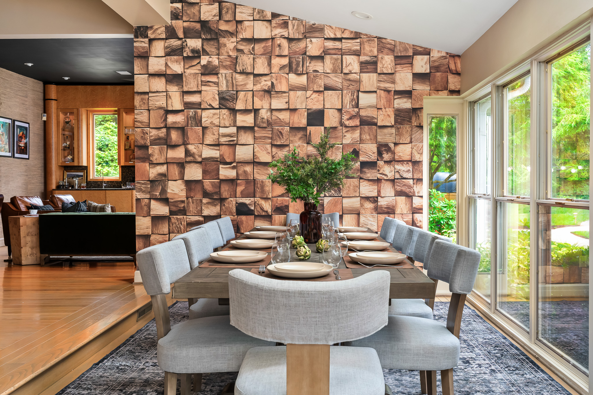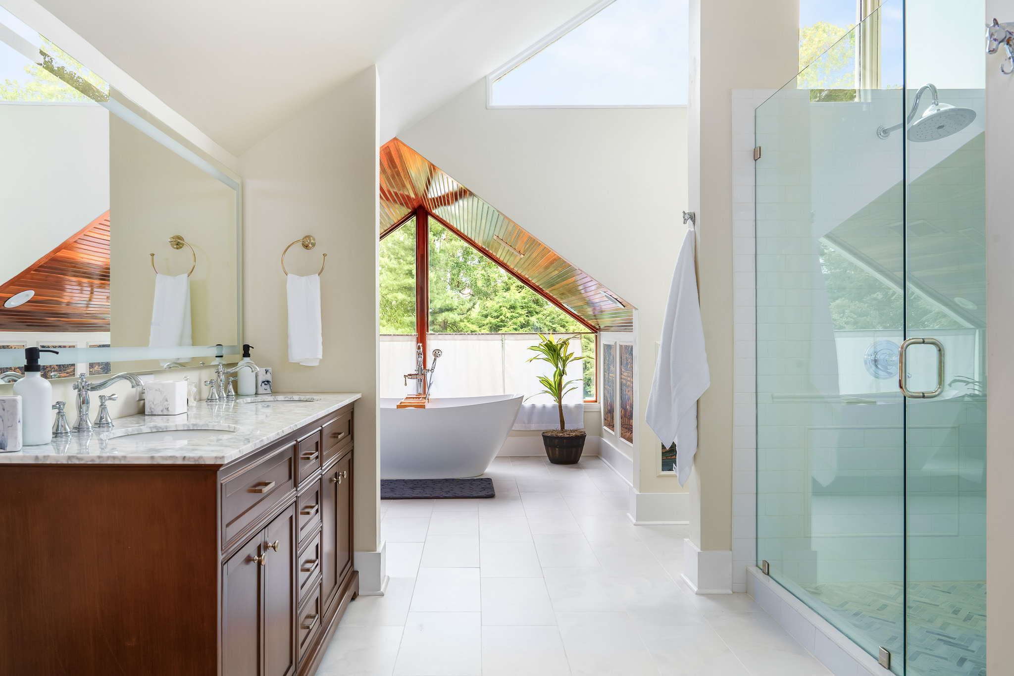 ◾Floor-to-ceiling glass wall framed by a vaulted cedar ceiling/roofline