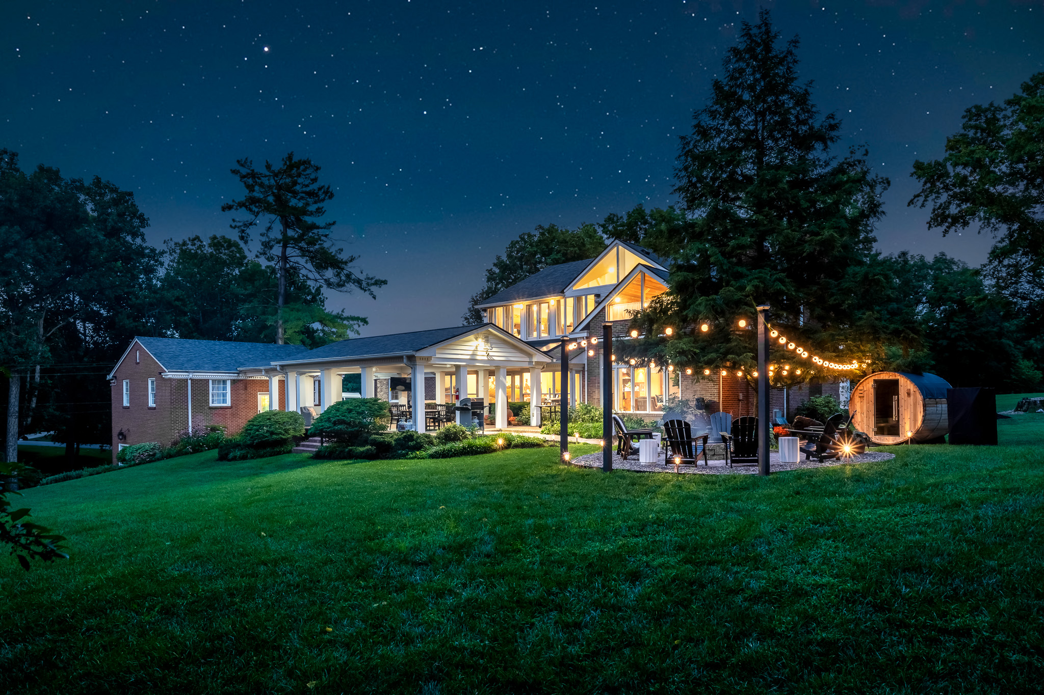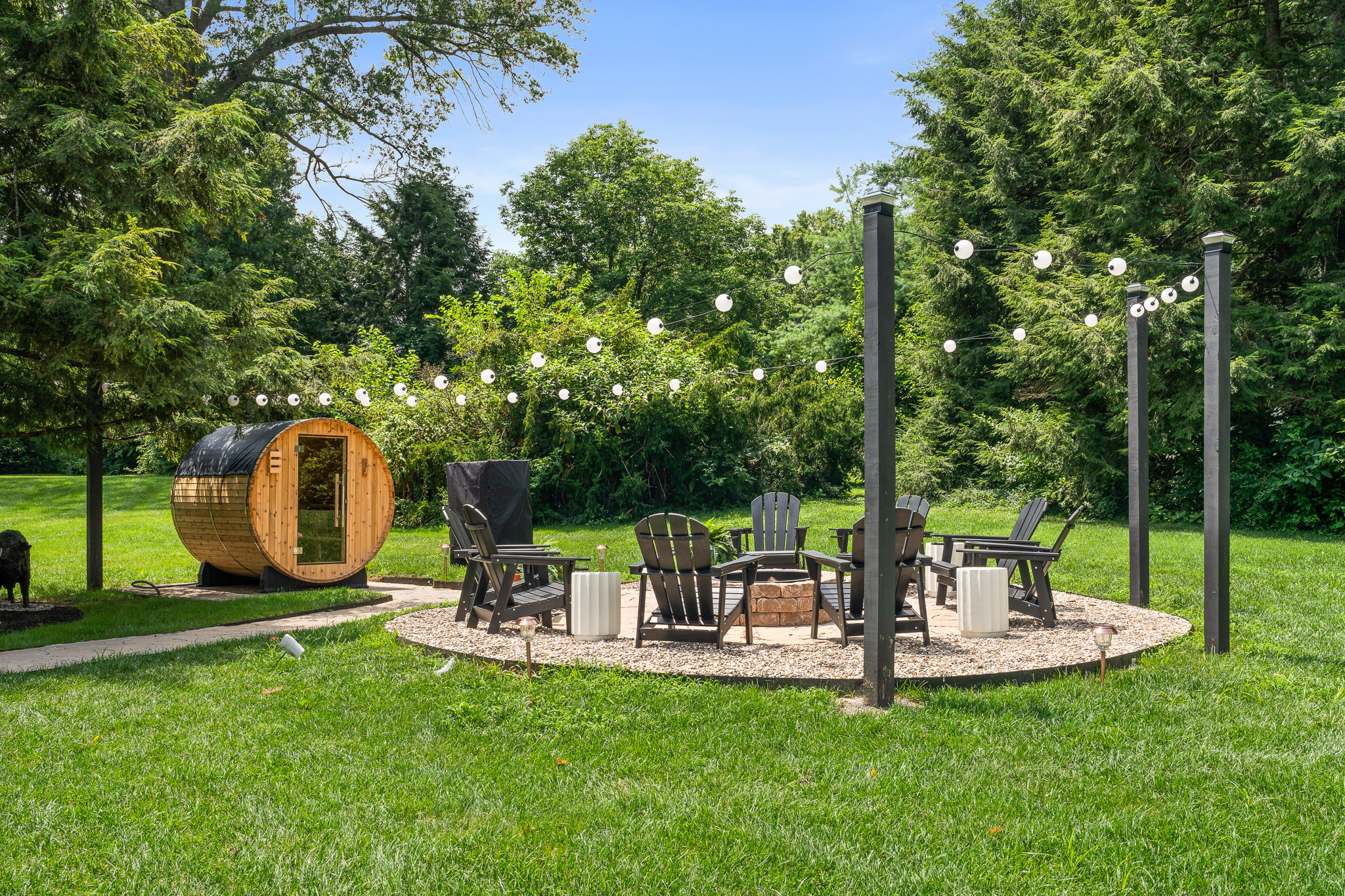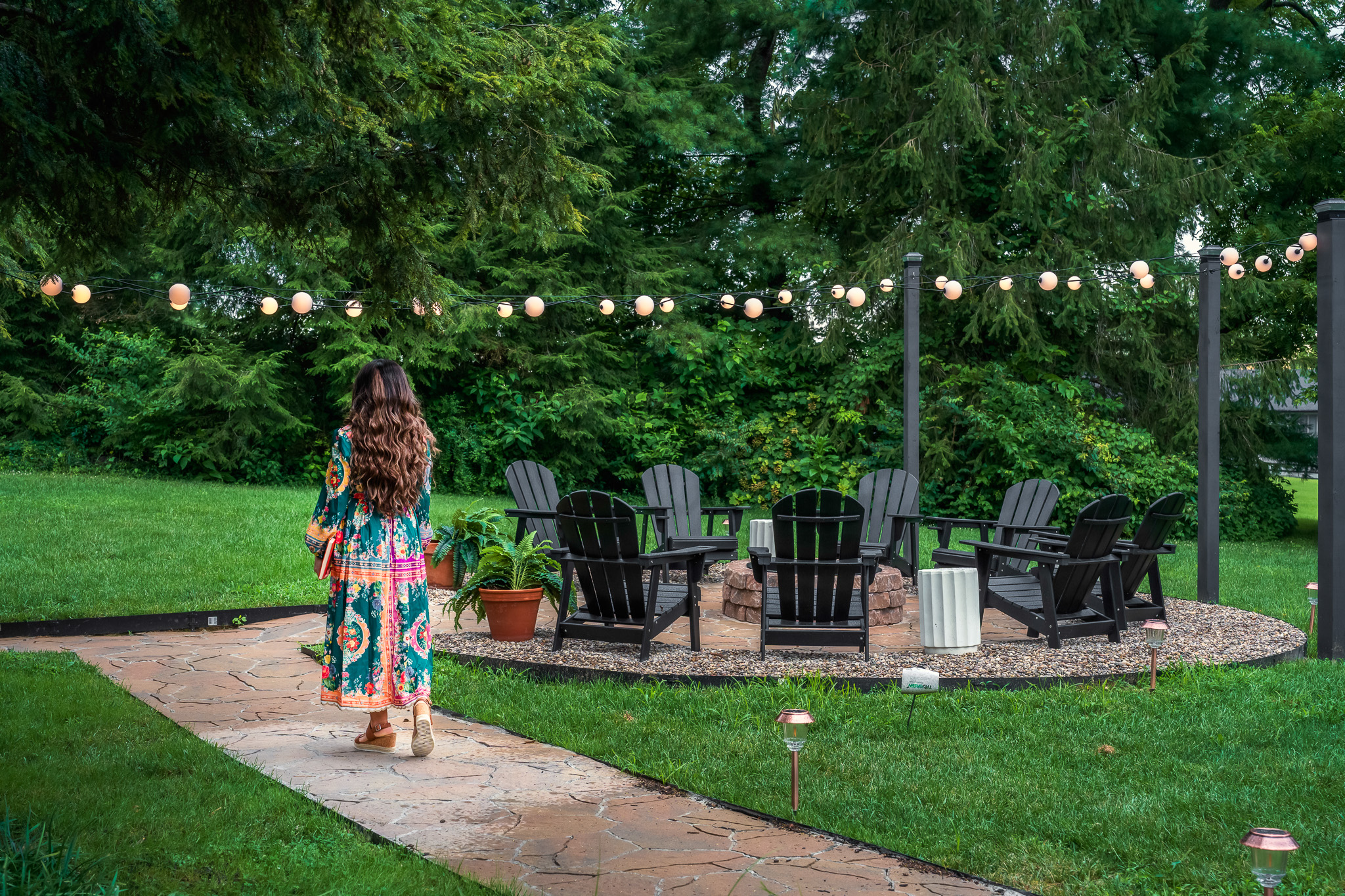 ◘ Firepit with orb string lights and solar lights 🔥🪵