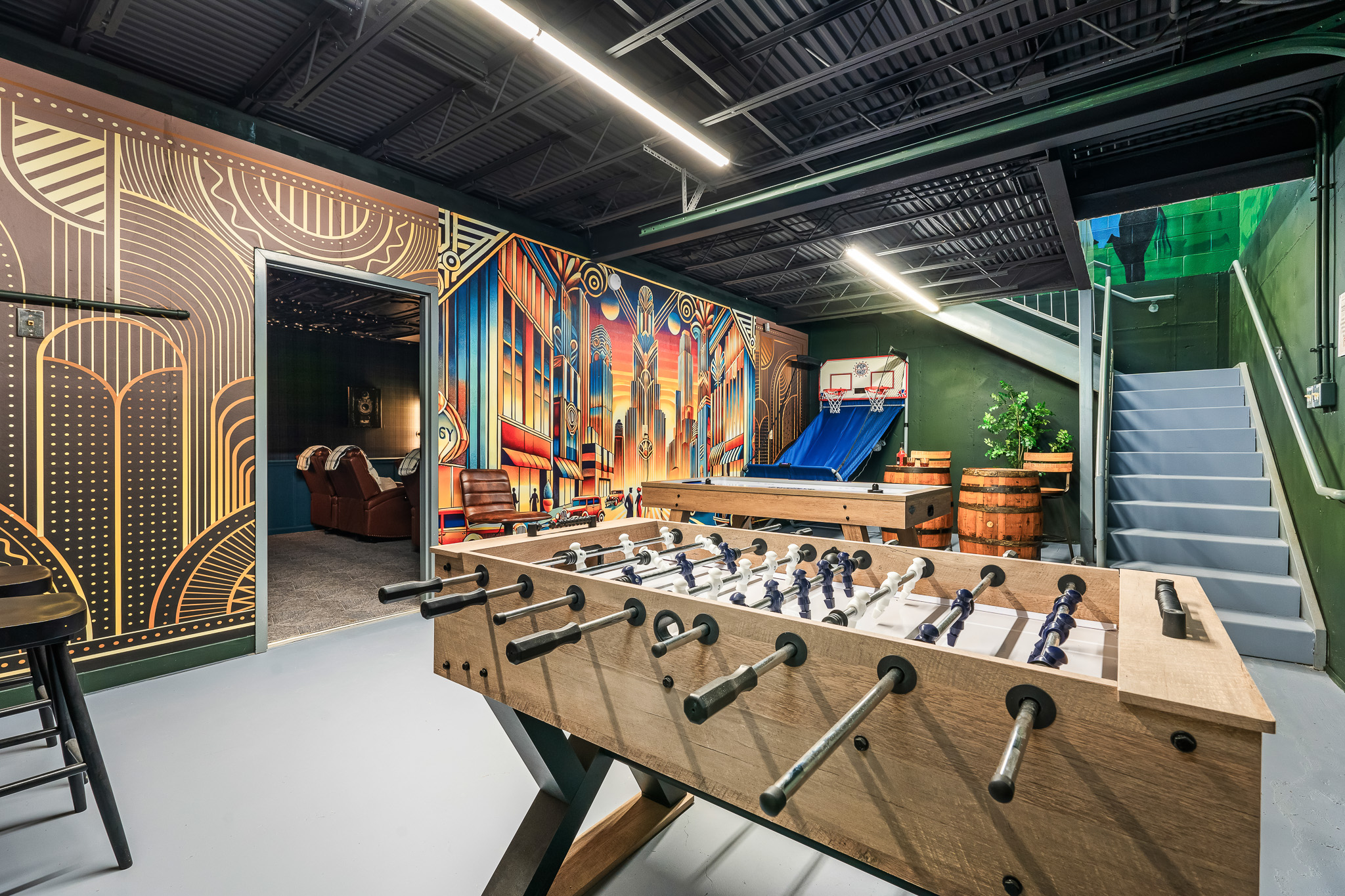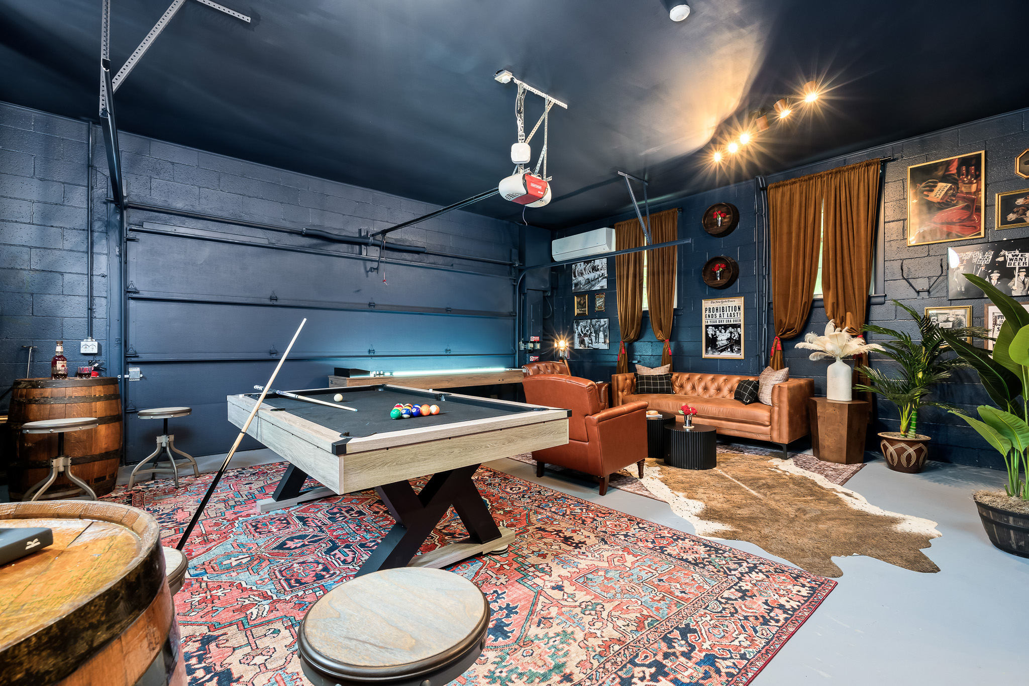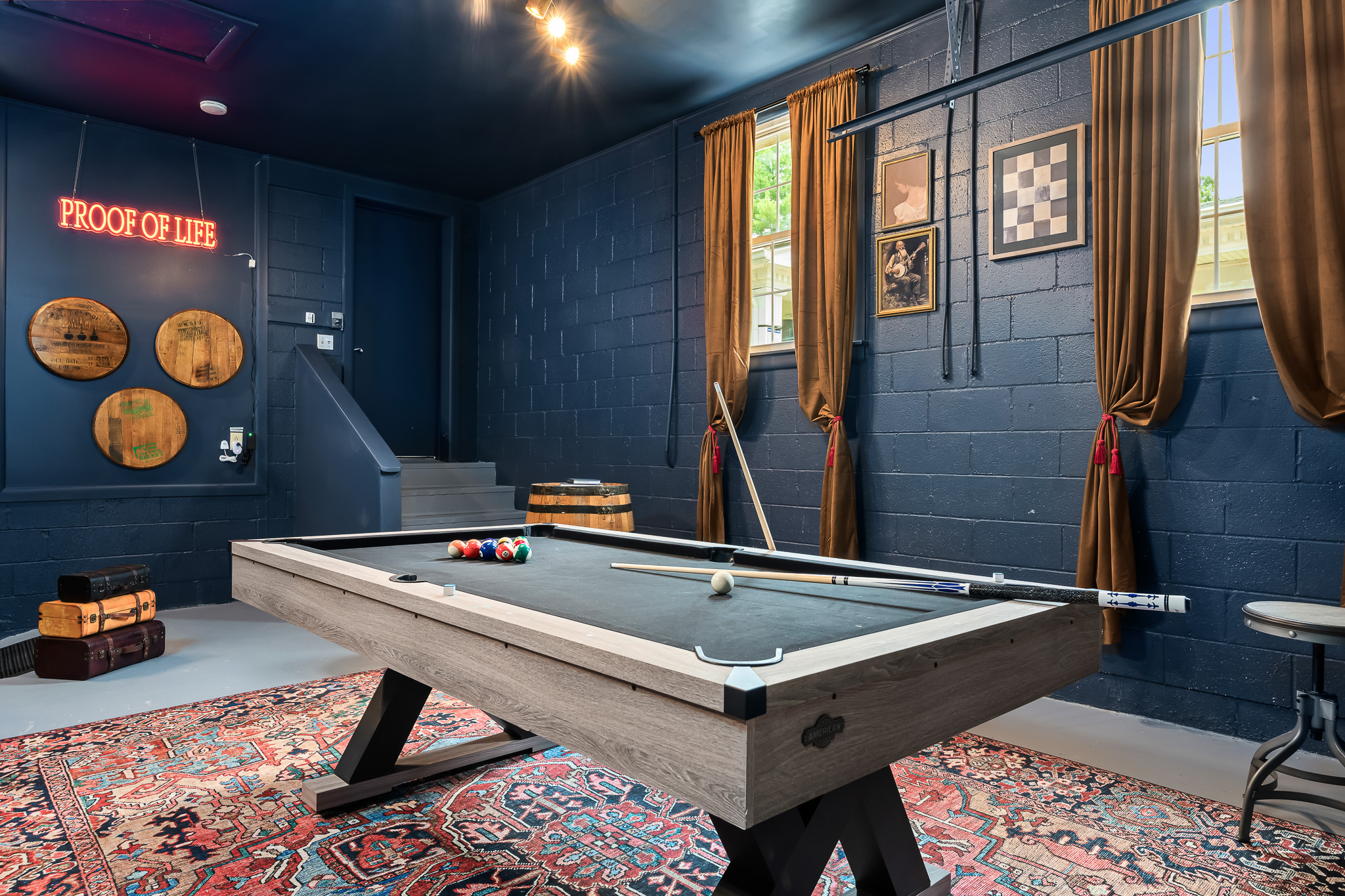 Welcome to "Proof of Life"—where timeless charm meets modern indulgence across two distinct spaces: "The Heart of Proof", our elegant main residence complete with the Speakeasy Annex, and "The Playhouse", a detached entertainment haven featuring a private theater, game room, turf-lined golf simulator with putting green, and a custom mural that brings the course to life.
