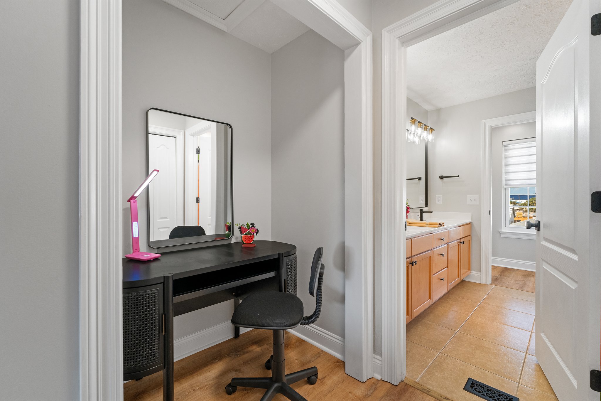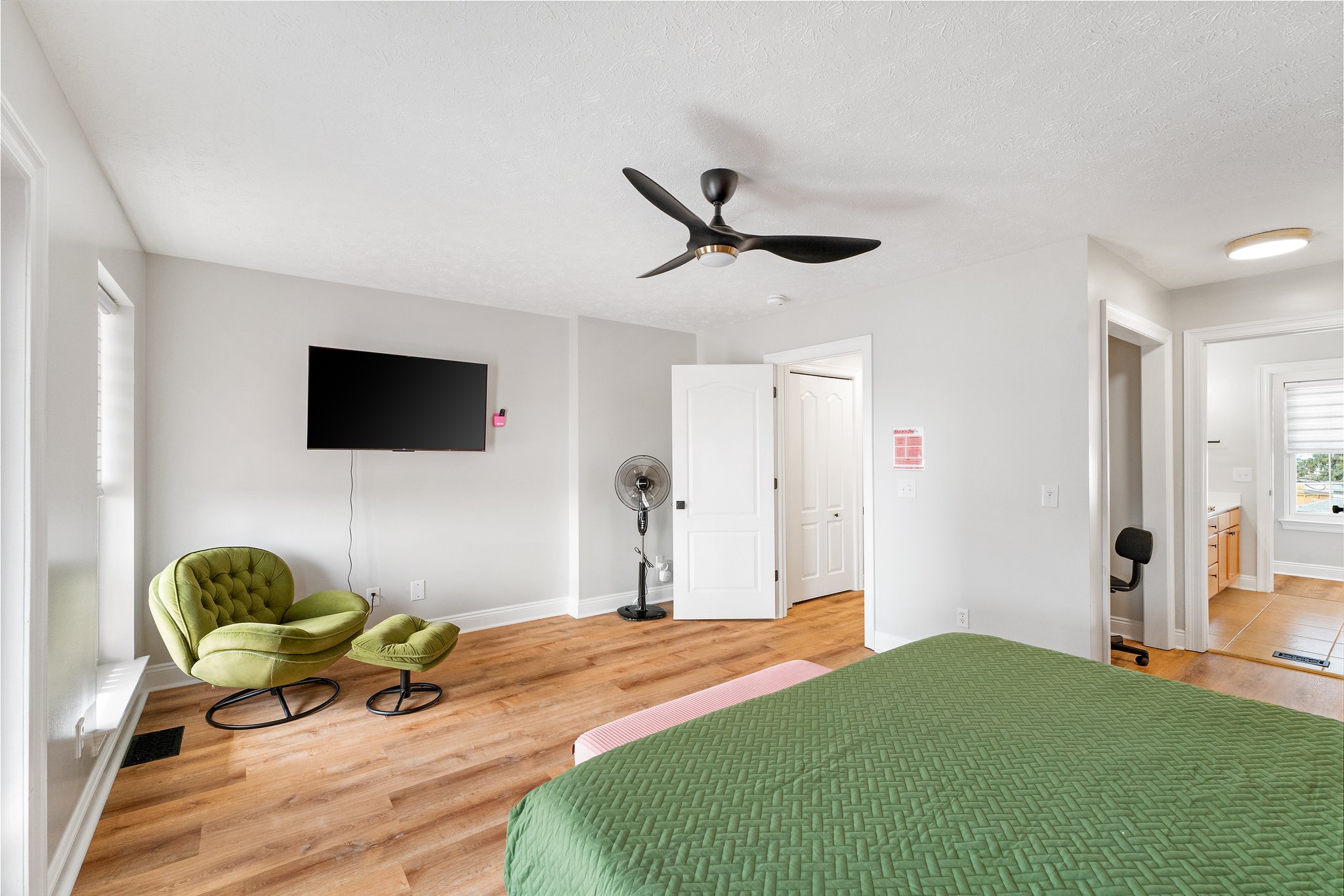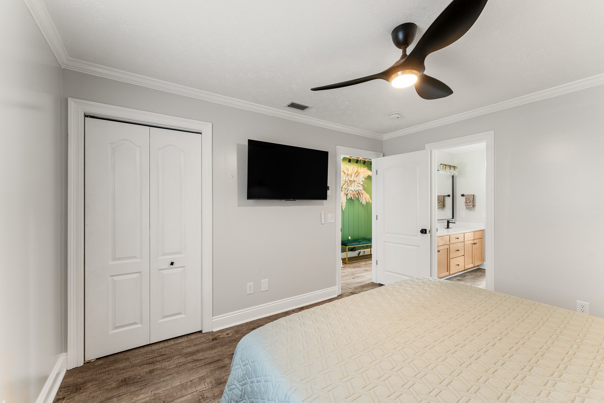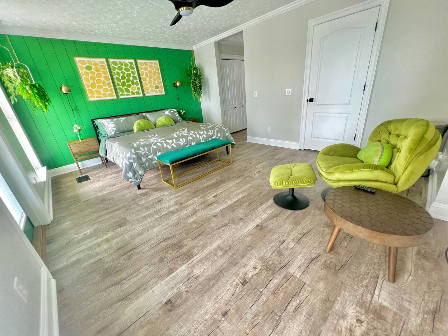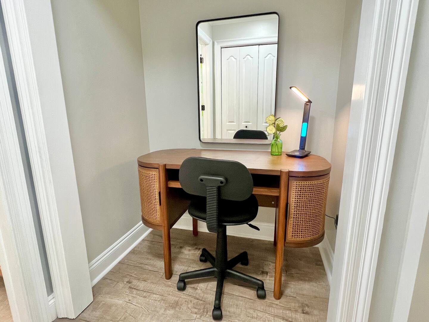 ◘ Back Bedroom: King bed, swivel chair with ottoman, closet, Roku TV, workspace