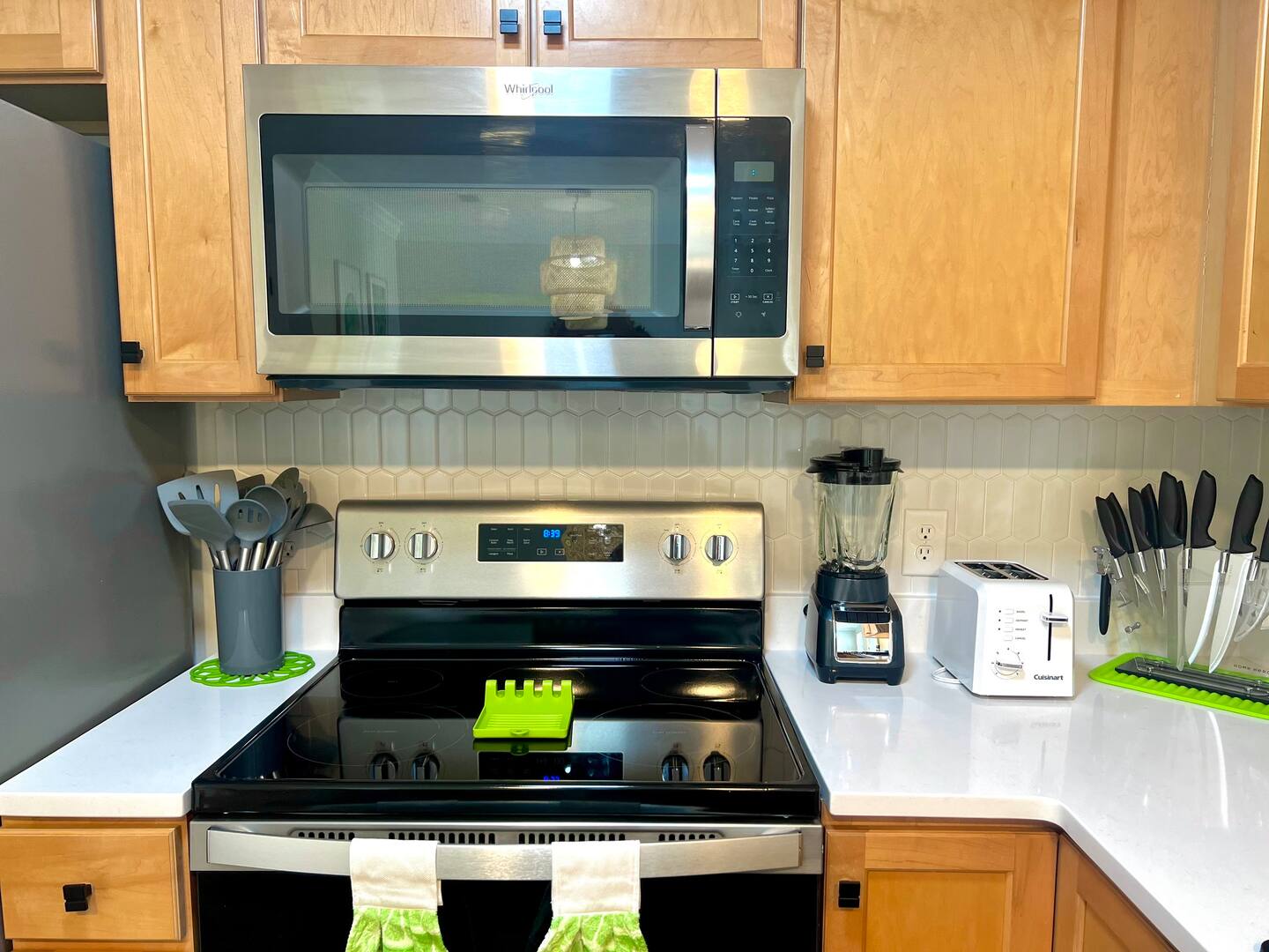 ◘ Kitchen with stove, oven, refrigerator, dishwasher, microwave, toaster, blender, cookware, glassware